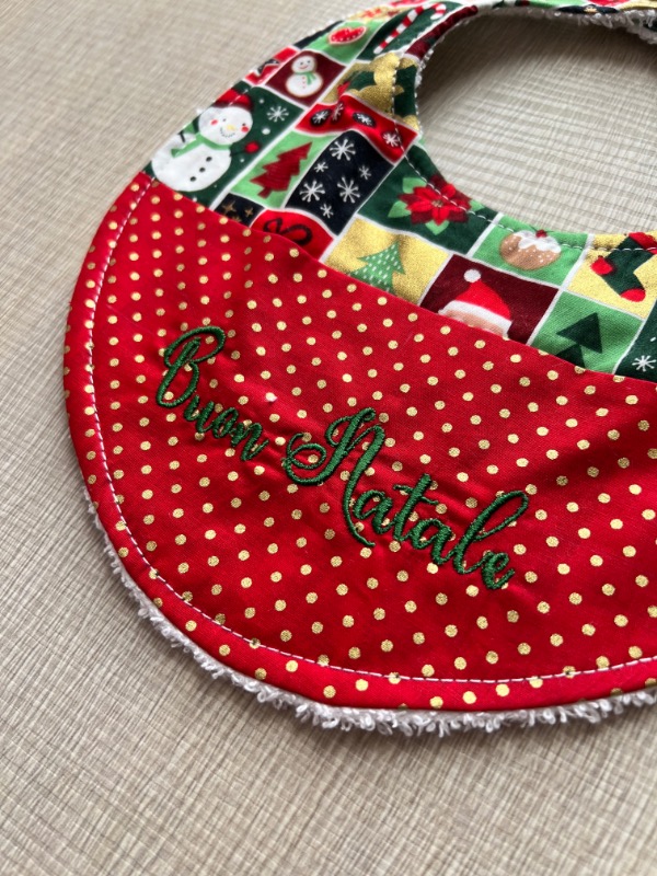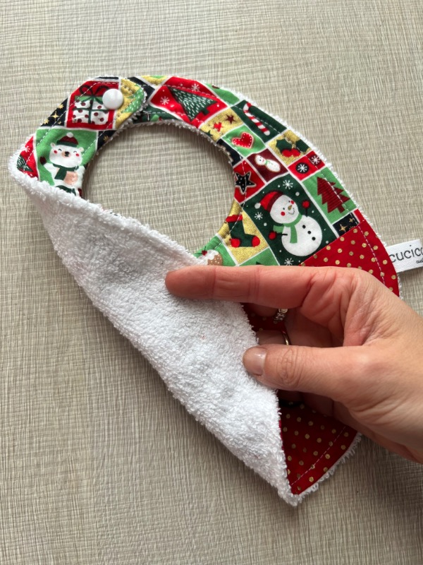 Bavaglino a tema natalizio in cotone e spugna 100% certificati e atossici, quindi adatti ai bambini e alla loro pelle delicata.