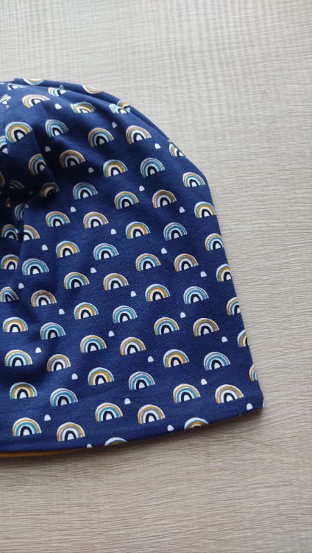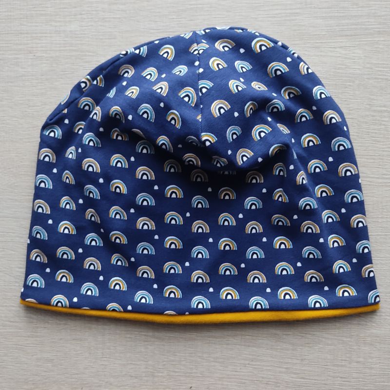 Questo berrettino tema arcobaleni interno senape è realizzato in morbido jersey, perfetto per proteggere il vostro bimbo durante la mezza stagione e l’inverno non troppo freddo.