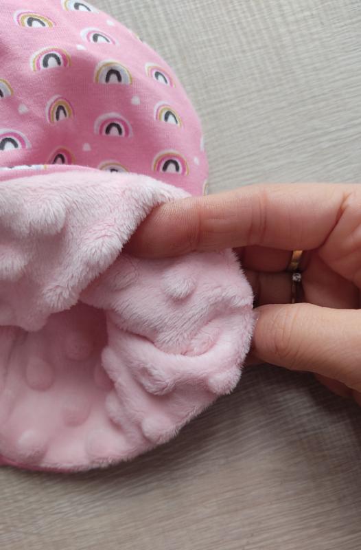 Questo berrettino è realizzato in morbido jersey e minky pile, perfetto per proteggere il vostro bimbo durante i mesi più freddi dell’anno.