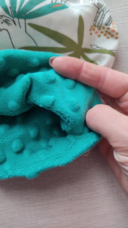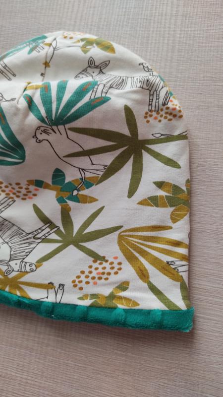 Questo berrettino è realizzato in morbido jersey e minky pile, perfetto per proteggere il vostro bimbo durante i mesi più freddi dell’anno.