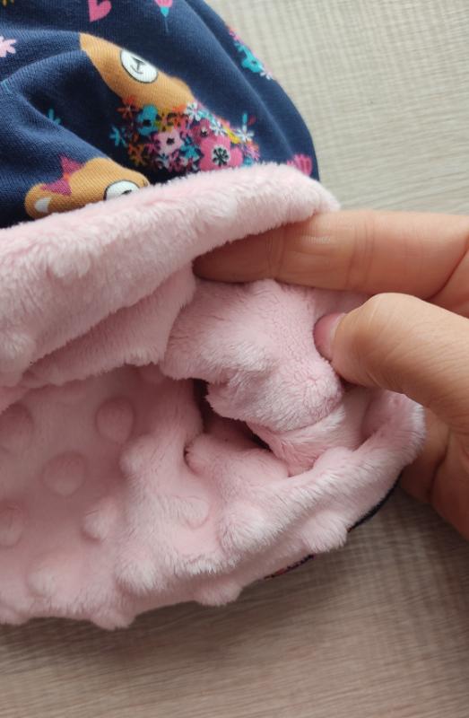 Questo berrettino è realizzato in morbido jersey e minky pile, perfetto per proteggere il vostro bimbo durante i mesi più freddi dell’anno.