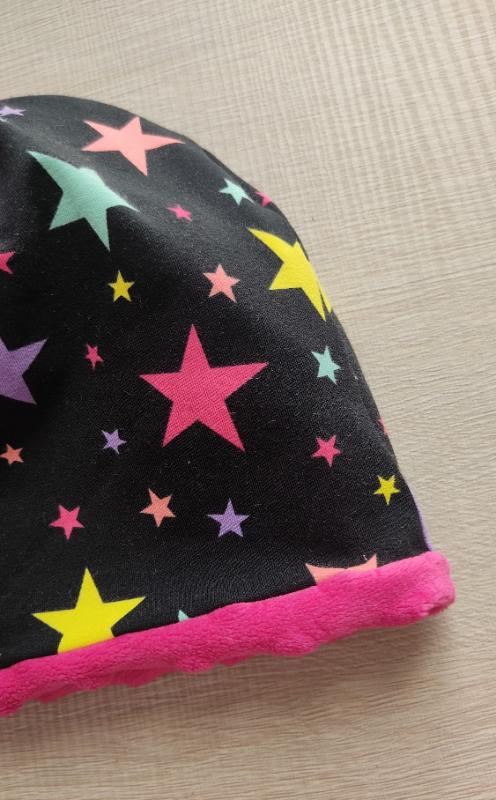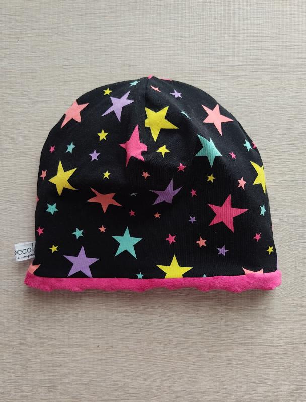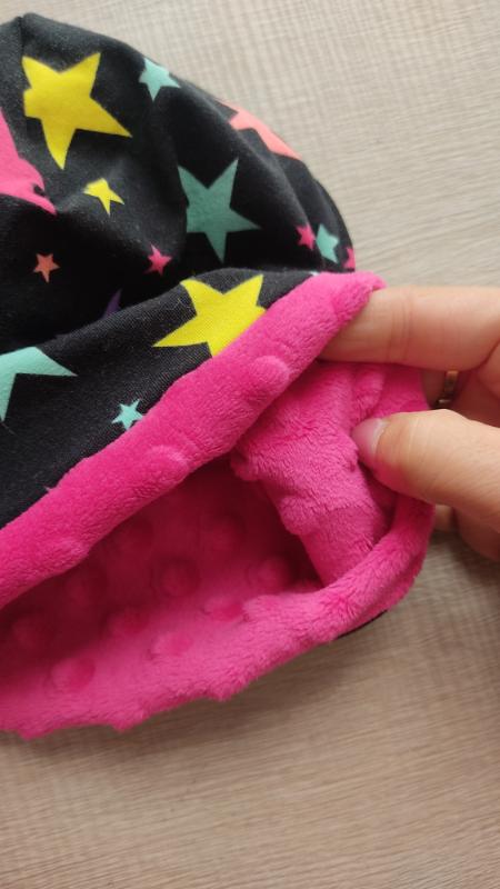 Questo berrettino è realizzato in morbido jersey e minky pile, perfetto per proteggere il vostro bimbo durante i mesi più freddi dell’anno.