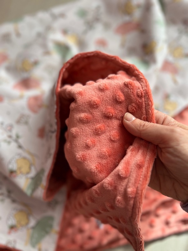 Questa dolcissima copertina è realizzata in cotone e sofficissimo minky pile ed è perfetta per proteggere il bimbo in qualsiasi stagione.