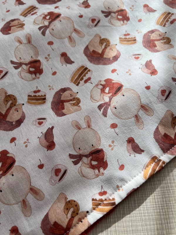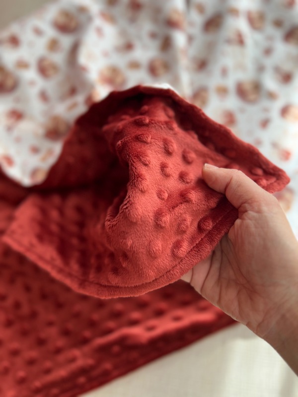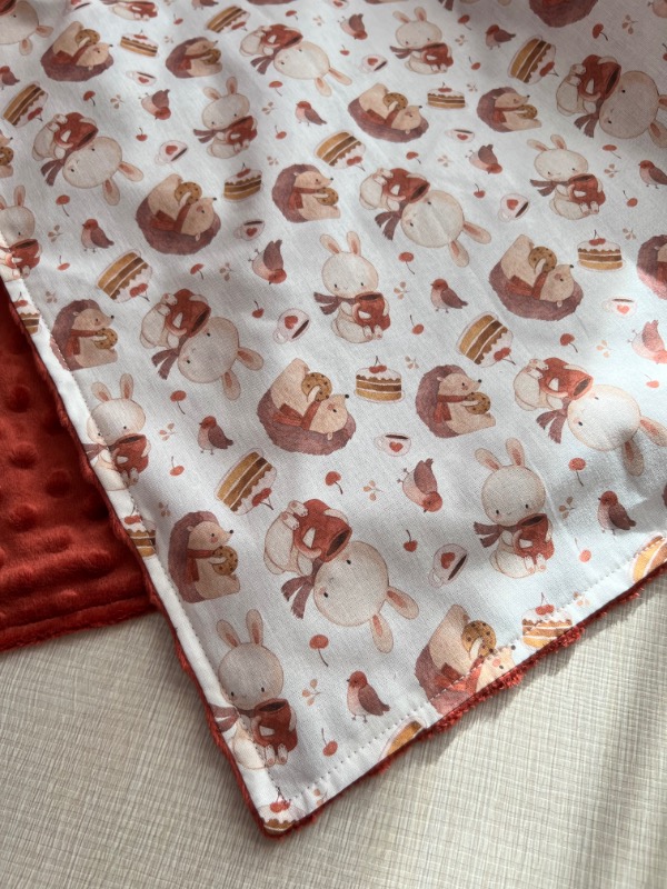 Questa dolcissima copertina è realizzata in cotone e sofficissimo minky pile ed è perfetta per proteggere il bimbo in qualsiasi stagione.