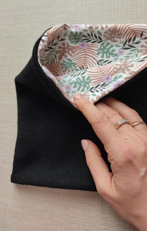 Scaldacollo in maglina nera e jersey in fantasia, di media pesantezza, perfetto da indossare in autunno.