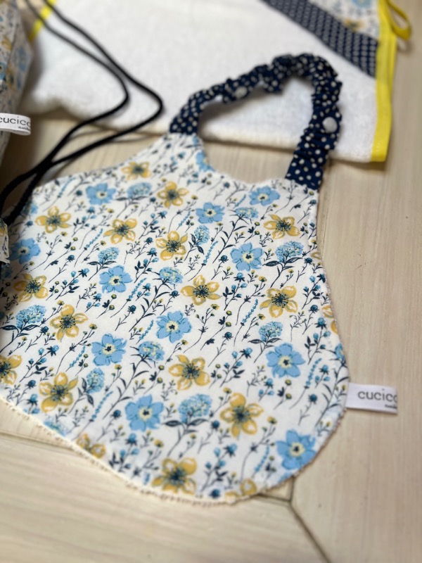 Davanti in tessuto fantasia, retro in spugna di cotone assorbente. Grazie all’elastico e al bottoncino sul collo, si adatta perfettamente dal nido fino all’ultimo anno della materna.