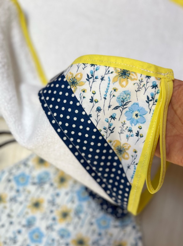 Morbido e super assorbente, rifinito con bordo colorato e inserto in tessuto coordinato. Con gancio per appenderlo all’asilo in tutta comodità.
